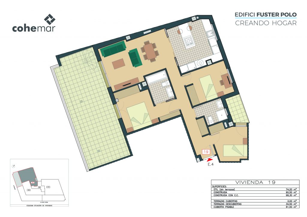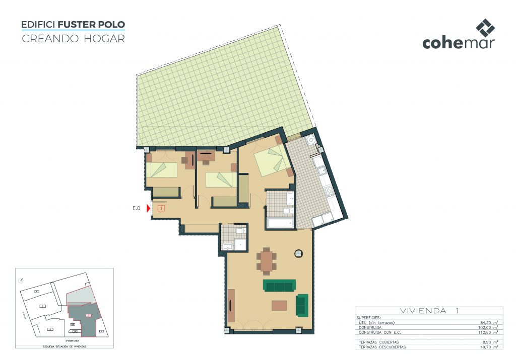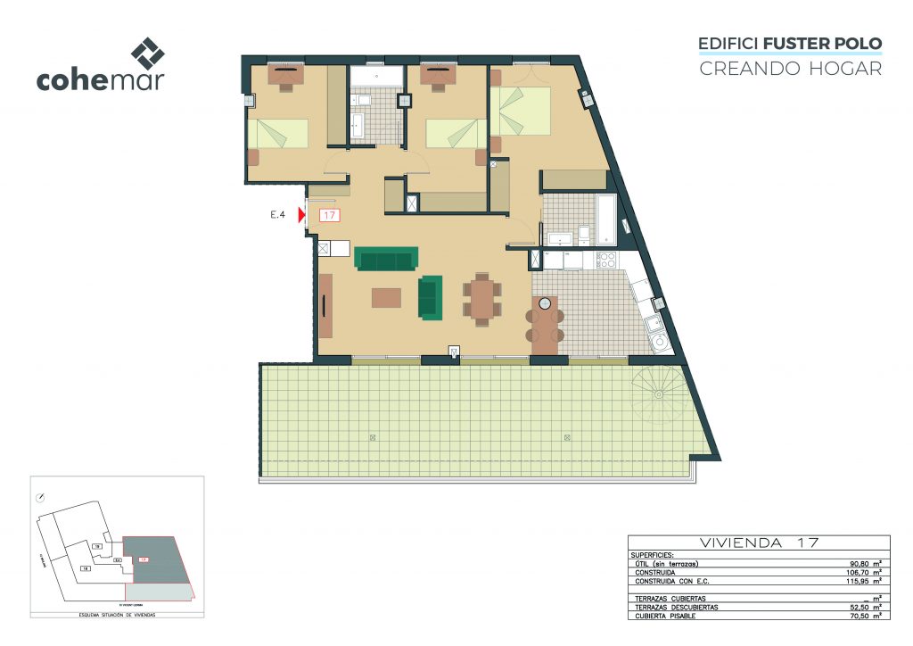 Vivienda de 110 m2 con 3 habitaciones, terraza cubierta de 8,90 m2 y terraza descubierta de 49,70 m2.