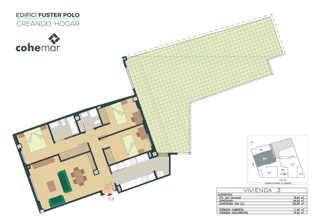 Vivienda de 102 m2 con 3 habitaciones, terraza cubierta de 11,40 m2 y terraza descubierta de 74,40 m2.
