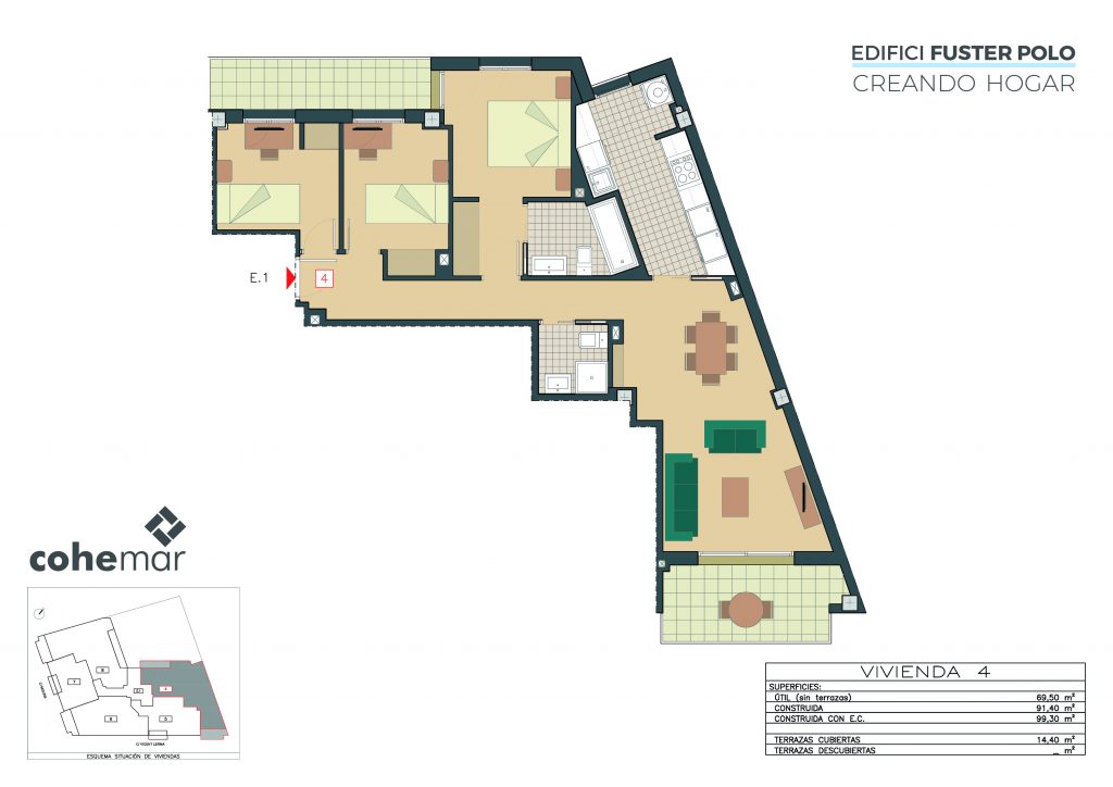Vivienda de 99 m2 con tres habitaciones, 2 baños y dos terrazas cubiertas con un total de 14 m2.