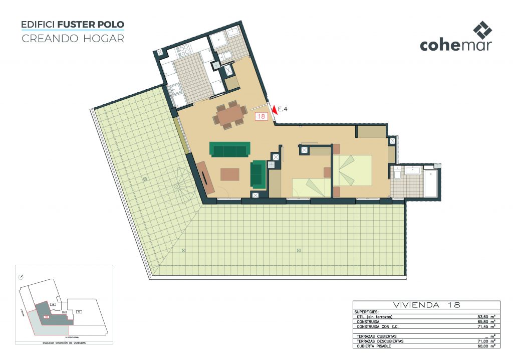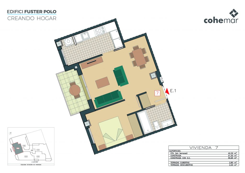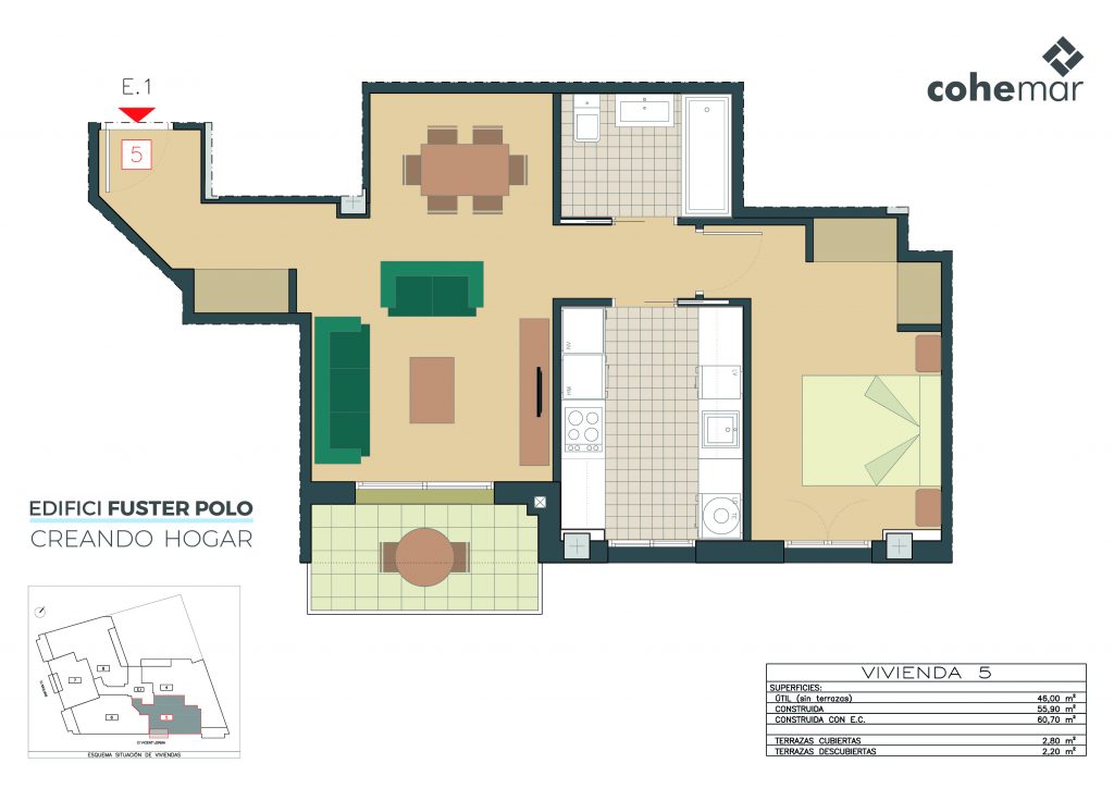 Vivienda de 60 m2 con una habitación, un baño, terraza cubierta de 2,80 m2 y terraza descubierta de 2,20 m2.
