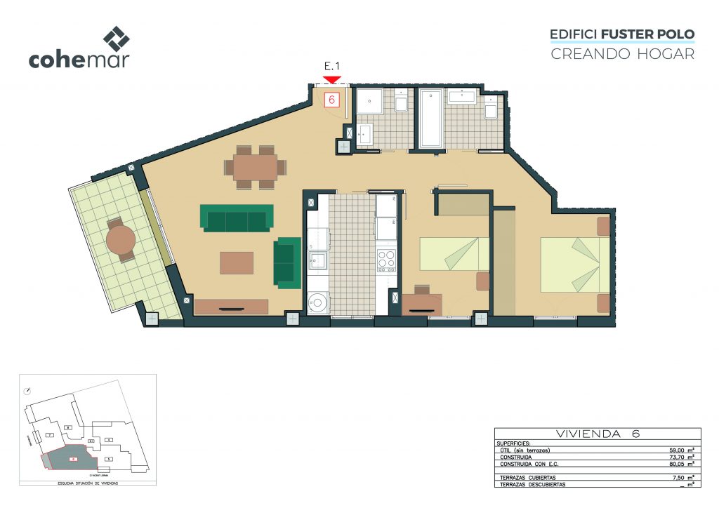 Vivienda en primera planta de 80 m2 de 2 habitaciones, dos baños y una terraza cubierta de 7,50 m2.