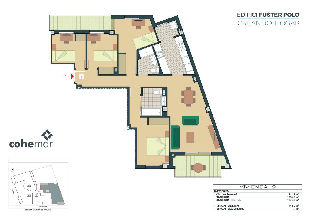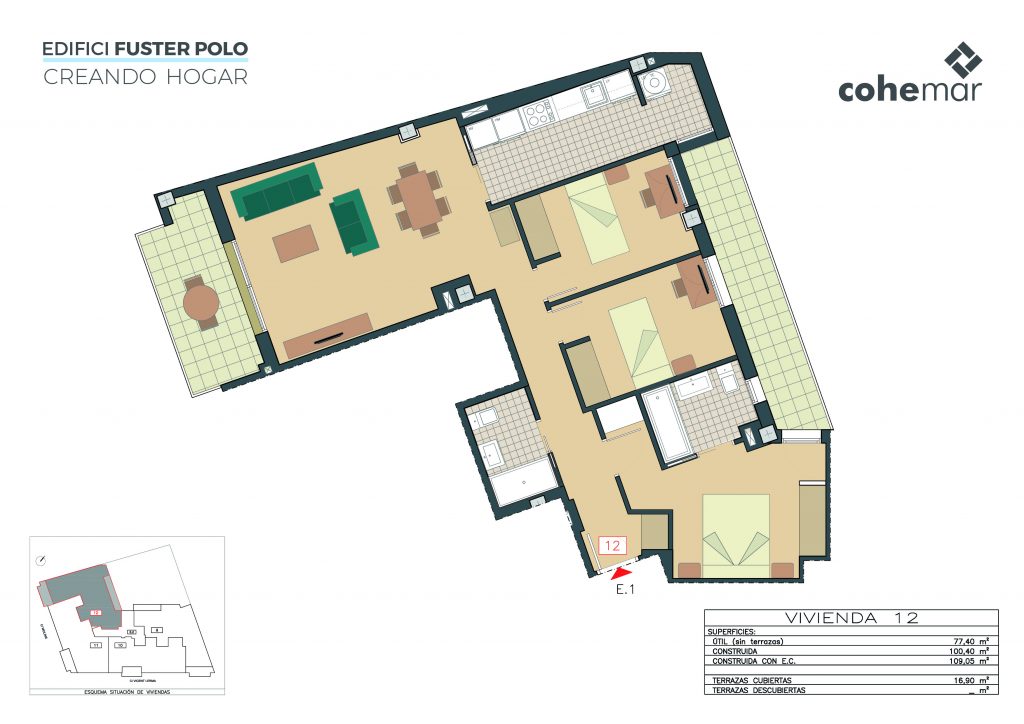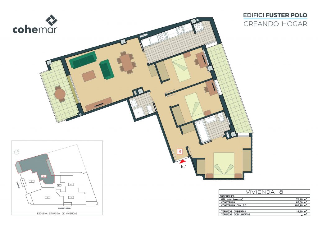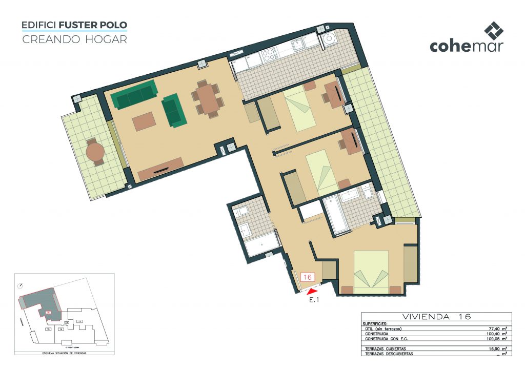 Vivienda de 105 m2 con tres habitaciones, dos baños y una espaciosa terraza cubierta de 16,90 m2 .