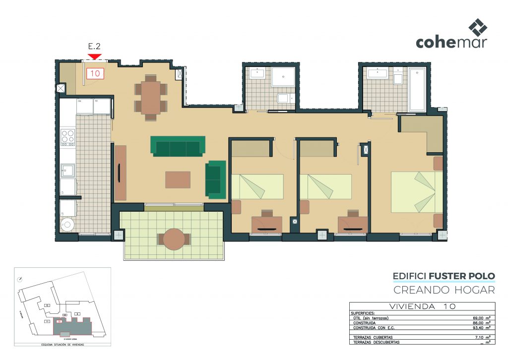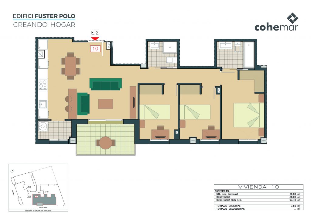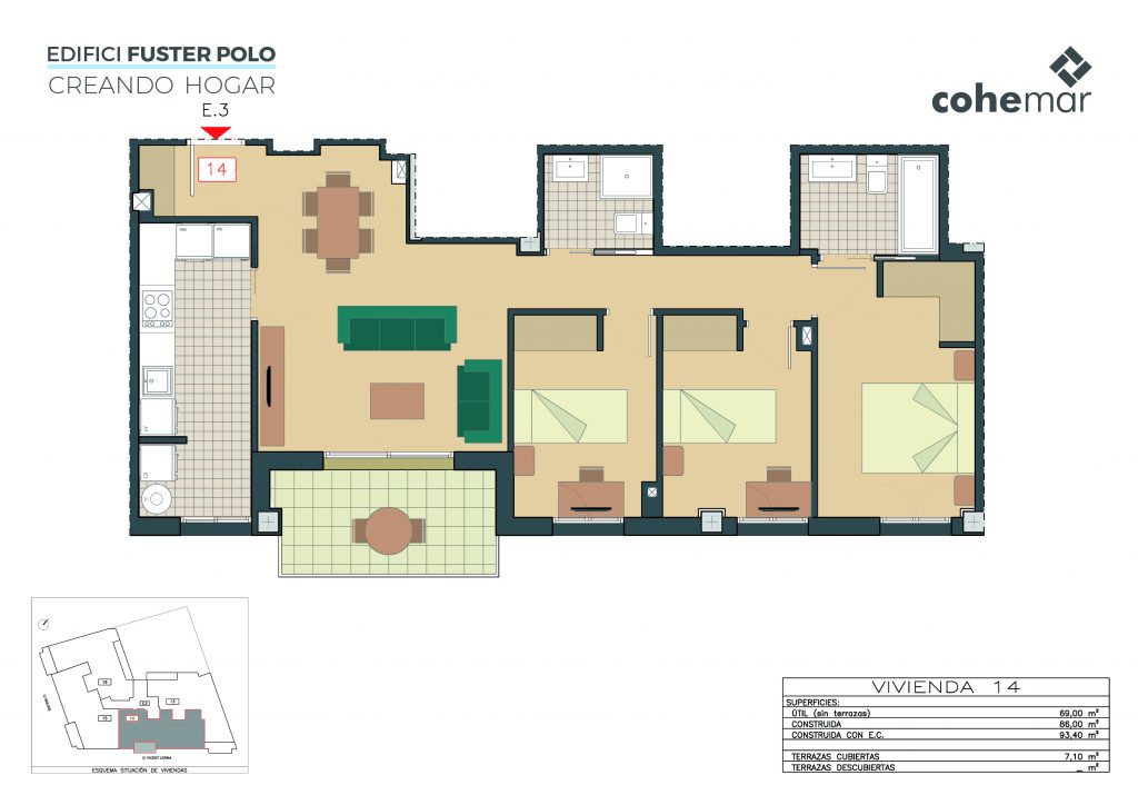 Vivienda de 93,40 m2 de tres habitaciones y dos baños, y una amplia terraza cubierta de 7,10 m2.