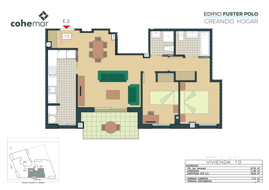 Vivienda de 78 m2 personalizable (admite cambios en nº habitaciones) y con una terraza cubierta de 7,10 m2 .
