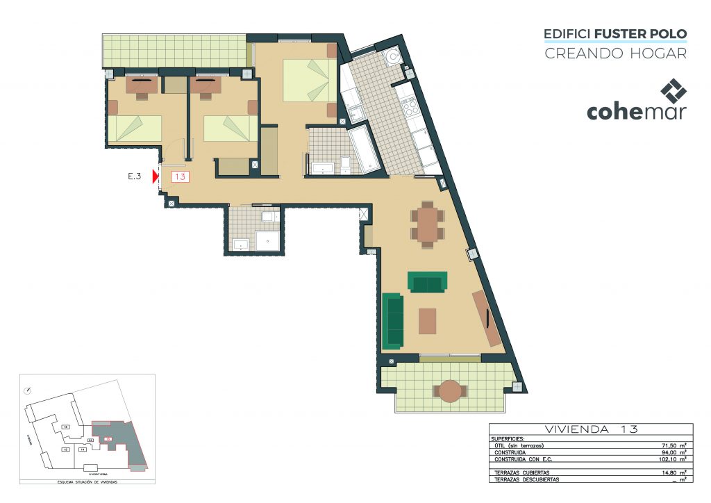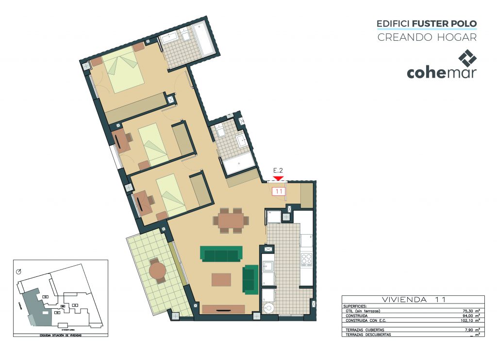 Vivienda de 102 m2 de tres habitaciones y dos baños, y una espaciosa terraza cubierta de 7,90 m2.