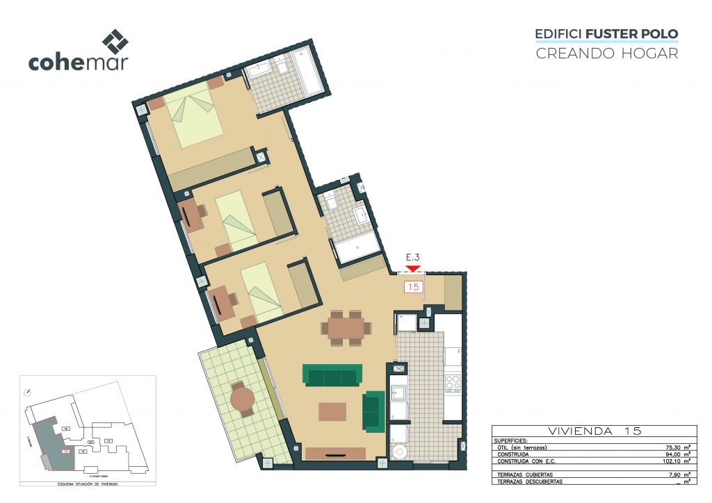 Vivienda de 102 m2 de tres habitaciones y dos baños, y una amplia terraza cubierta de 7,90 m2 .